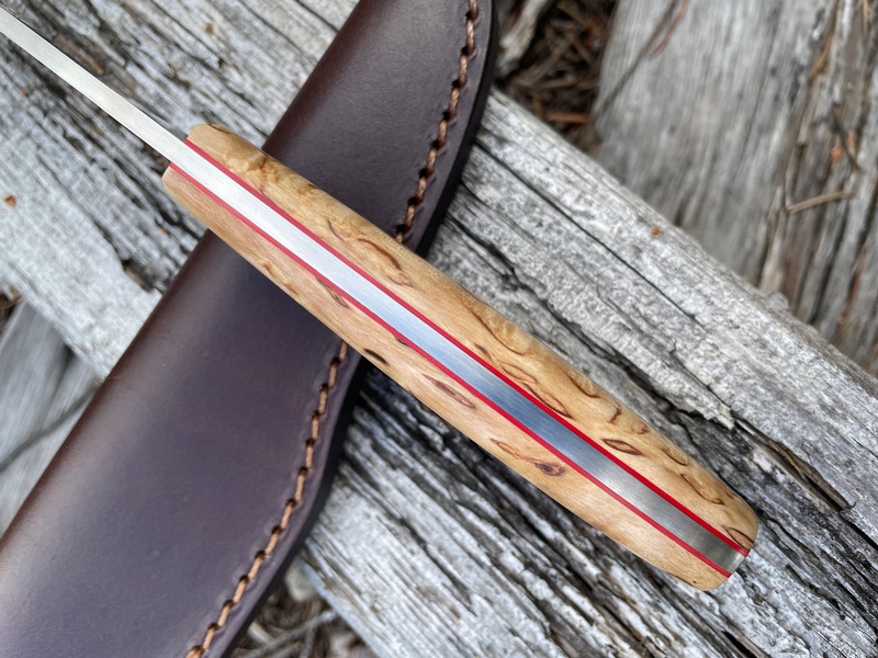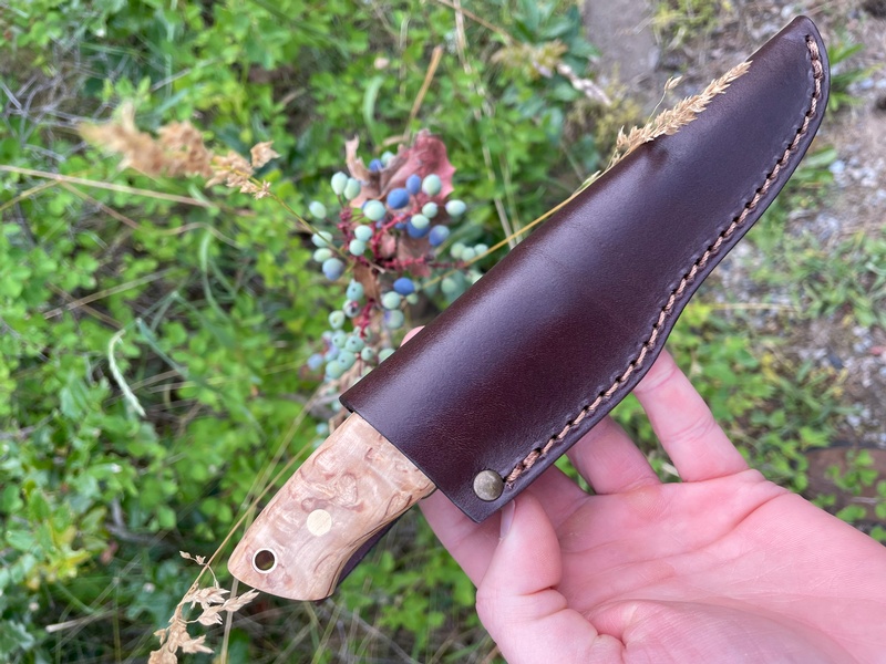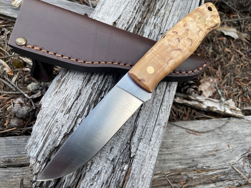 This Trapper is flat grind, comes with leather scandi style dangler sheath in leather.