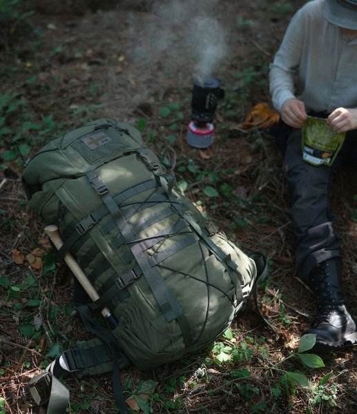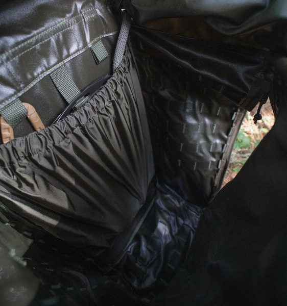 The side zipper on the left side leads into a large, flat compartment on the front of the pack. Suitable for stuff like tarps and other flat packing gear. The sides and front have generous PALS webbing for attaching extra pouches and gear. The bottom has two rows of PALS webbing for attaching gear using packing straps or elastic cord. Two side compression straps with SR buckles on either side of the pack offer both compression and a means of carrying long, bulky tools and equipment or quickly attaching additional loads, such as a Hatka 12L daypack equipped with suitable buckles.