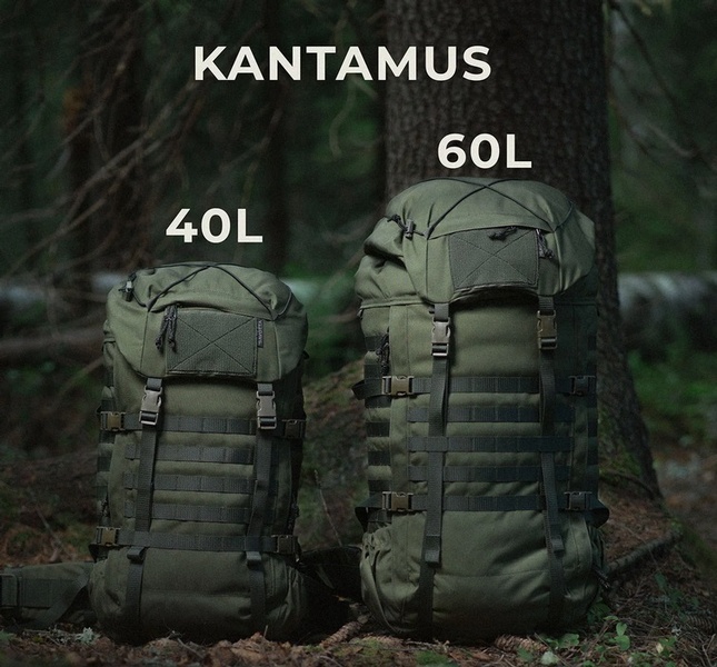 Kantamus 60L is the larger model in the Kantamus backpack lineup. A large, all-around multi-day pack. Internal aluminium frame supports heavier loads, shoulder strap attachment is adjustable to fit users of different length. Scalable and compressible to adapt to changing carrying needs. Main bag capacity ca. 60 litres, with ca. 12 litres of extra space in the lid and many external attachment points for additional side pouches and gear.
