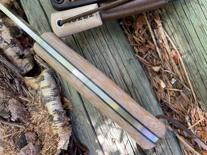 Overall length is just 8.5in, but the knife feels like a full sized Bush Knife and the strong Full Broad tang construction together with the solid pins and Natural Canvas Slabs.