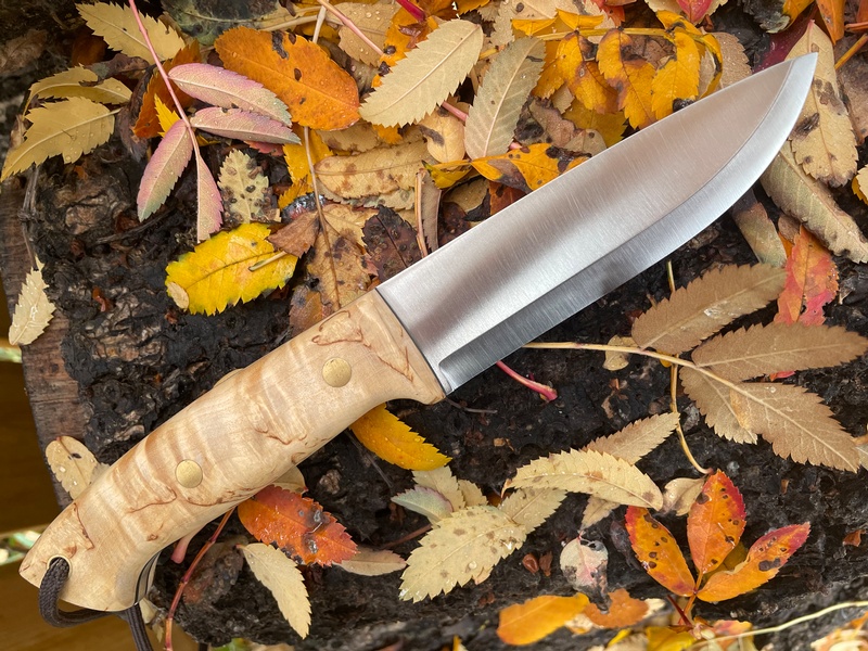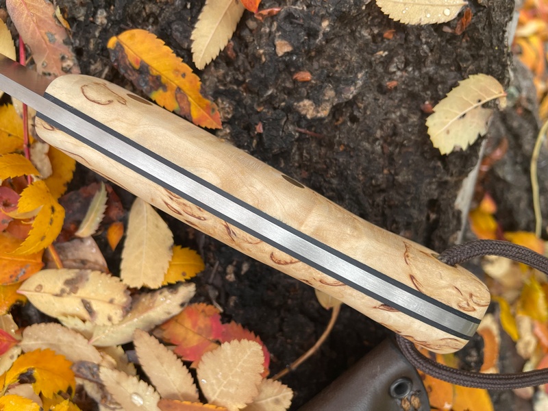 The full broad tang, the tough 14C28N Steel, Scandi ground for ease of sharpening, together with the sculptured Handle and classic blade shape, make the new Ranger a solid choice for Bushcraft~ Perfect for everyday Camp tasks or a 'do it all' Hiking and Hunting Companion.