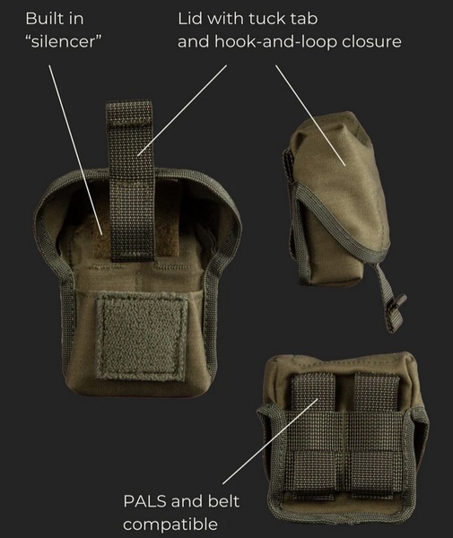 The lid on this pouch is closed using a polyethylene reinforced tuck tab and hook-and-loop. A tuck tab is mechanically very simple, but extremely reliable compared to plastic buckles, press studs or just using hook and loop. This is indeed almost identical to how the attachment straps are locked into place on all our PALS attachable pouches, just shorter and with a grip tab for rapid opening.