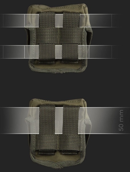 The rear features our standard PALS attachment webbing system with tuck tabs. The attachment straps can also be woven into belt loops for 45-50 mm wide belts.