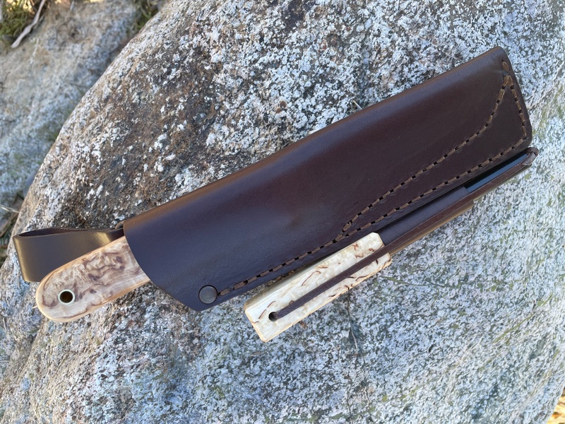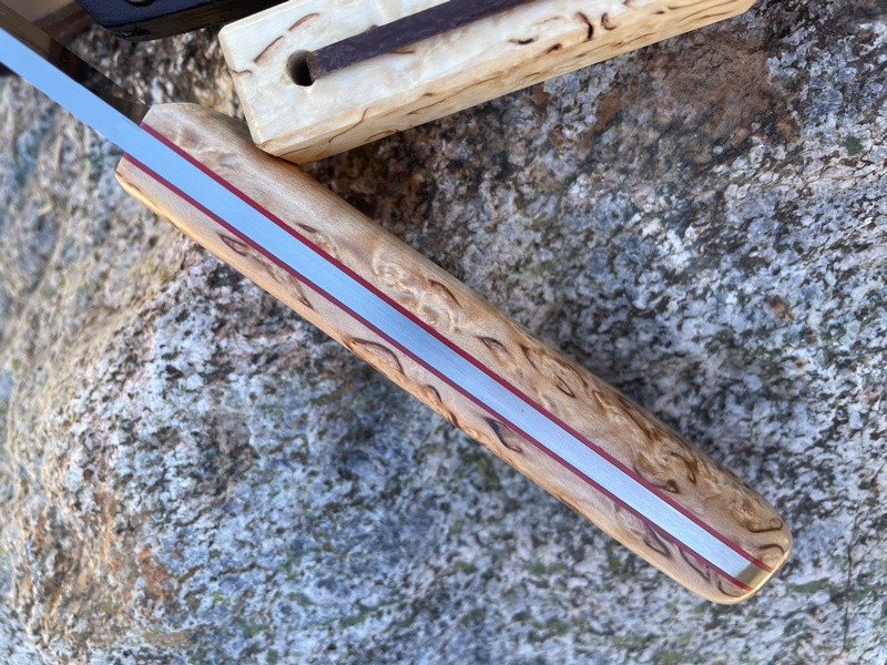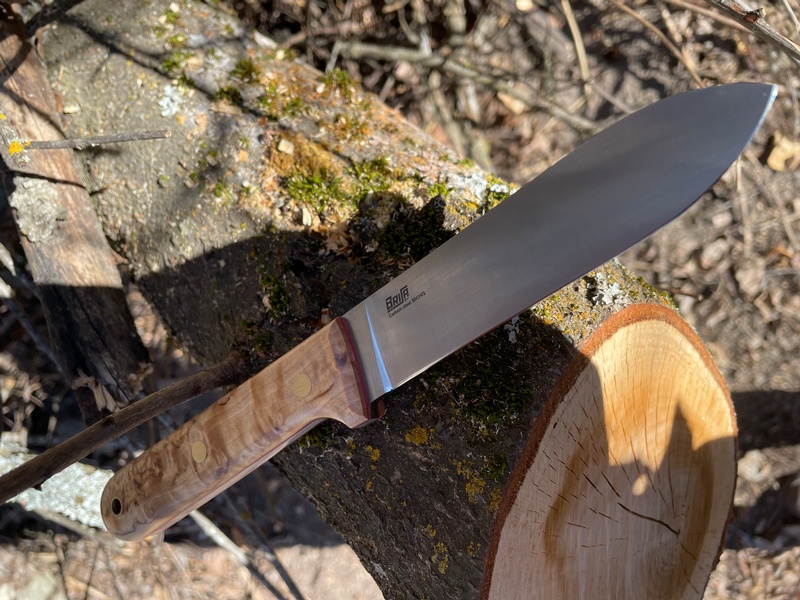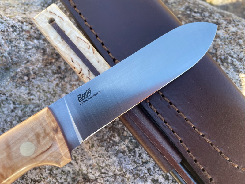 80CrV2 Steel, Flat ground makes for a tough, easy to maintain, Bushcraft and Camp Knife. The slabs are stabilized Curly Birch with Brass Pins and Brass Lanyard Hole.