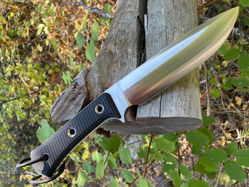 The Sabre ground 6.5in blade is 60HRC and gives tremendous bite, the balance and handling of the knife is excellent and the textured solid Micarta slabs are tough and grippy. Typically seen on smaller knives, ELMAX is an outstanding steel in terms of strength, edge holding and corrosion resistance, its one of the best choices for an outdoor knife and in the Apocalypse you have a lot of it!